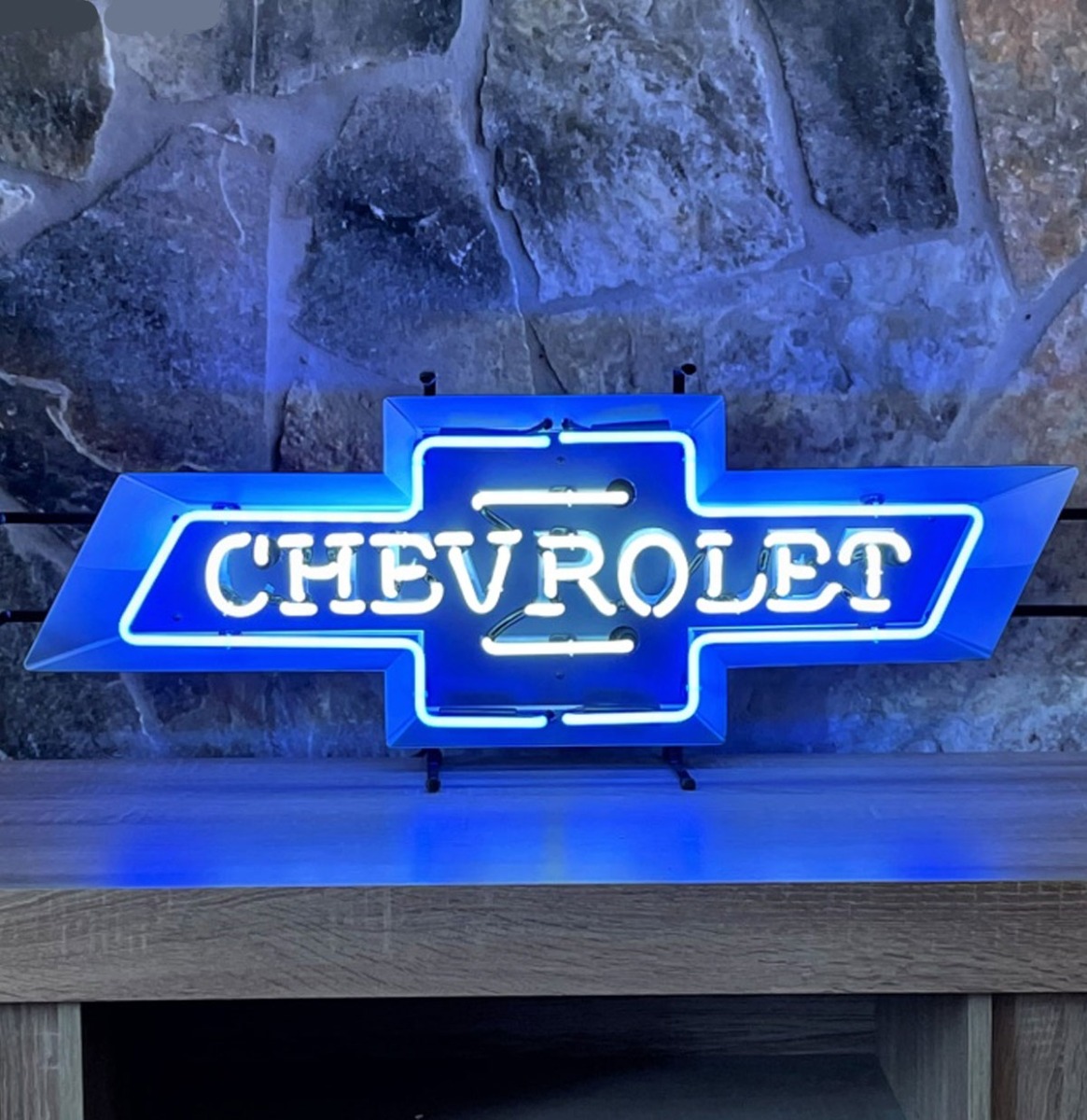 Het wereldberoemde Chevrolet-embleem is tot in detail nagemaakt in helder wit neon, omlijst door een intens blauwe gloed. De Bowtie lijkt bijna te zweven door de mooie dieptewerking van het glasneon.