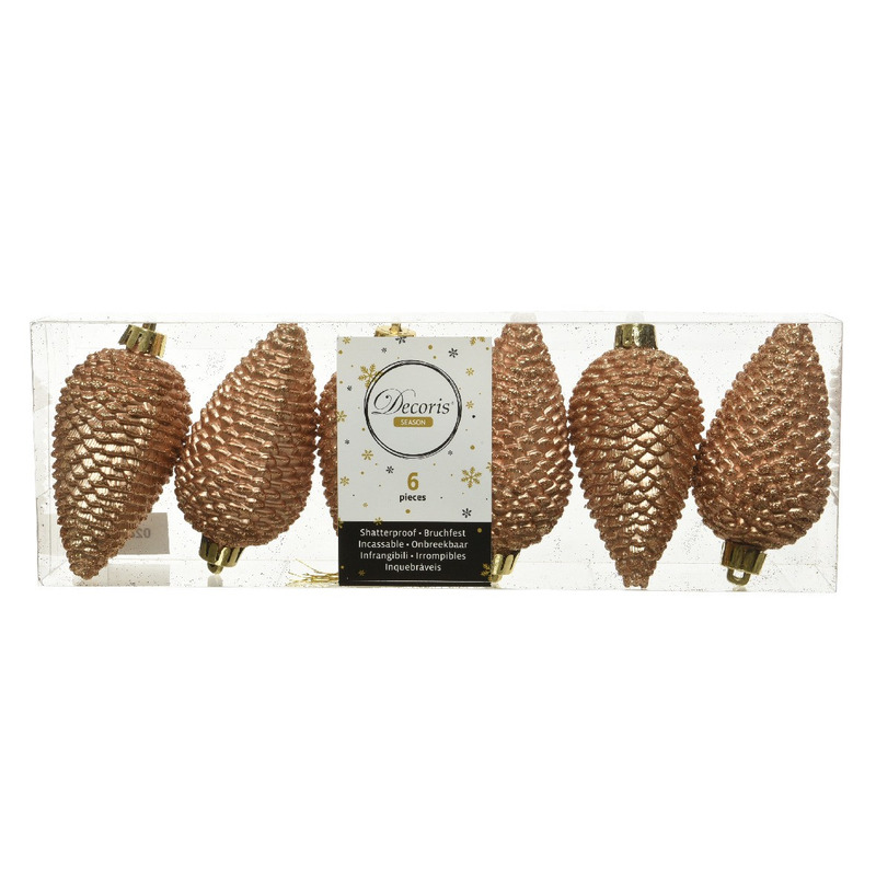Kersthangers dennenappels – 6x st – camel bruin – glitter – 8 cm – kunststof – kerstversiering — Decoris