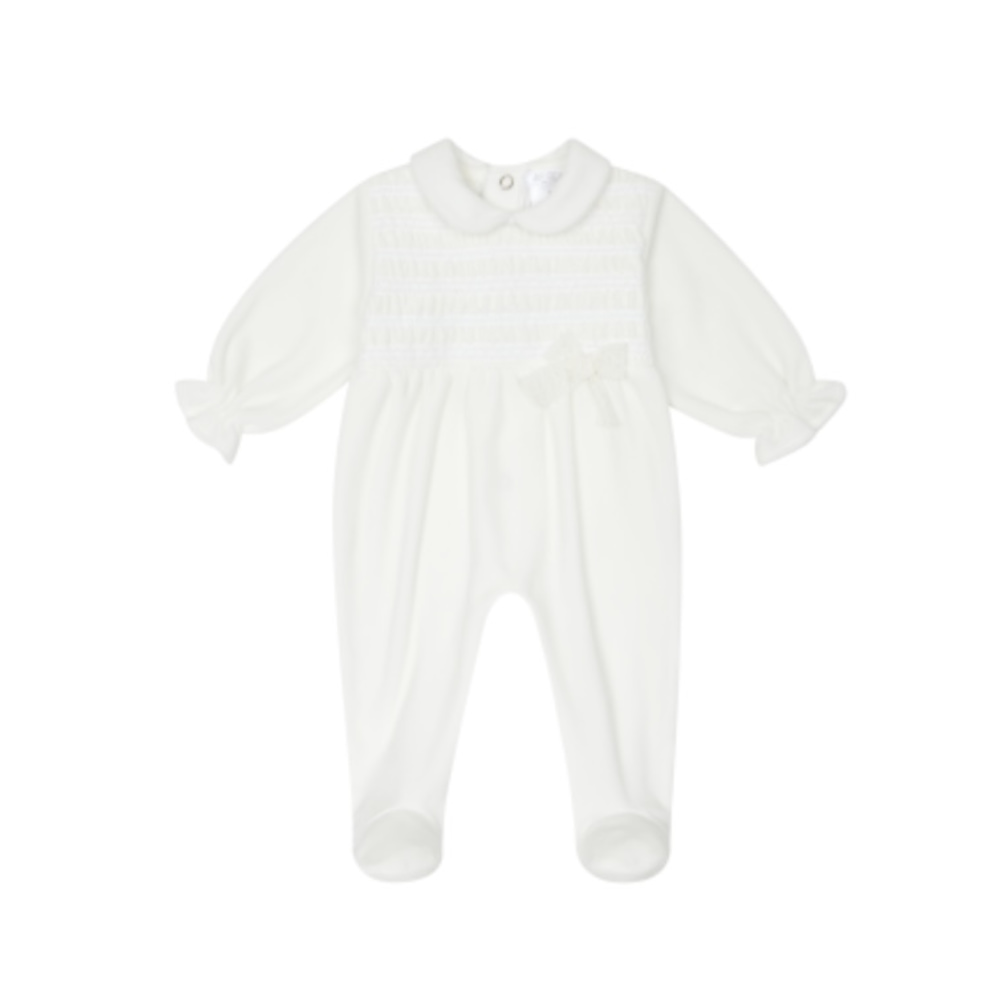 Bekijk product bij Bellabambina.nl — bestel vandaag nog en ontvang de Deolinda creme velours babypakje snel thuis.