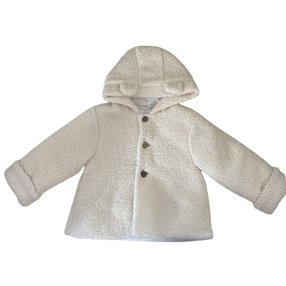 Lief teddy jasje van Deolinda. Het jasje heeft een capuchon met kleine oortjes erop. Sluit met houten knoopjes en is gevoerd met een zachte voering. Heerlijk jasje voor bijv in de maxicosi of kinderwagen.
