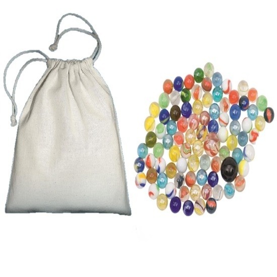 , Dit artikel bestaat uit:, 1x Glazen knikkers – mix in netje – 88x stuks – gekleurd – buitenspeelgoed – knikkeren, 1x Opbergzakje met koord – katoen – 25 x 30 cm – canvas cadeau zakje