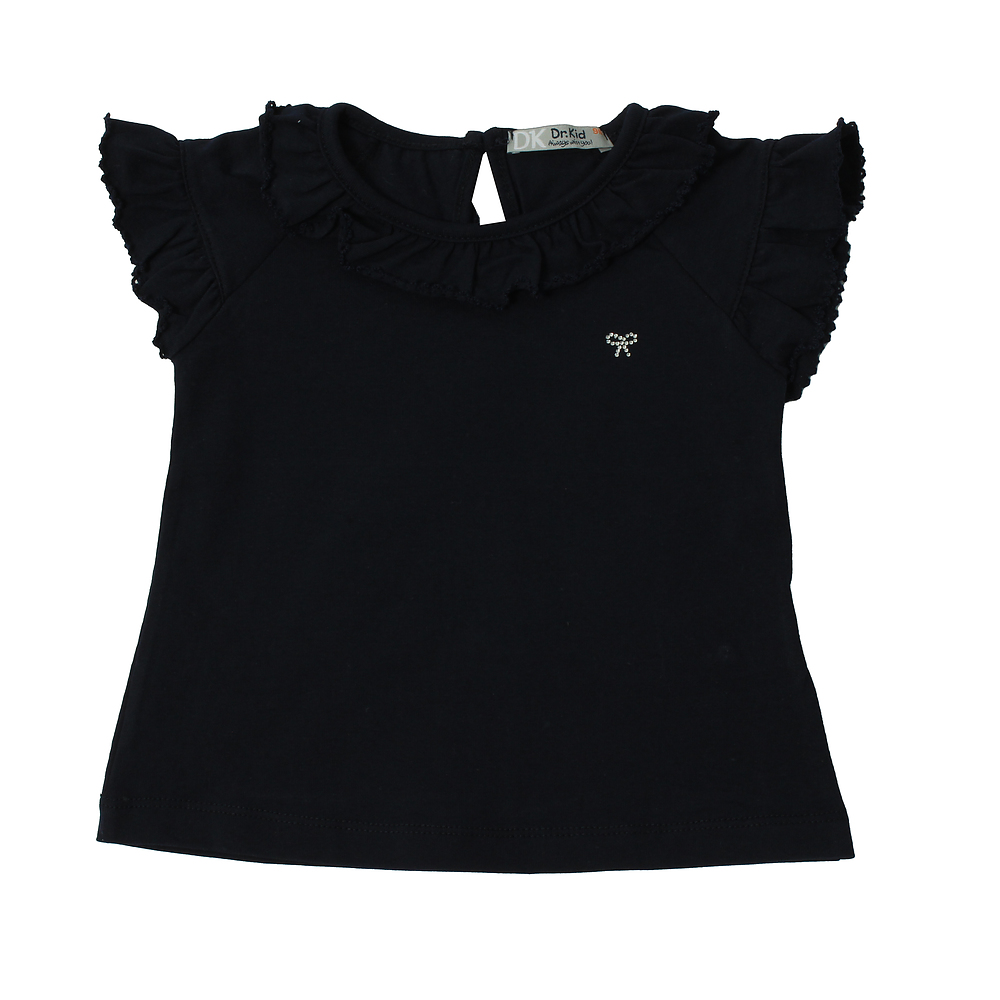 Donkerblauw t-shirtje met roezel kraagje van Dr.kid. Het t-shirtje sluit aan de achterkant met een knoopje en heeft een strass strikje op het voorpand. Ook in het wit wit verkrijgbaar.