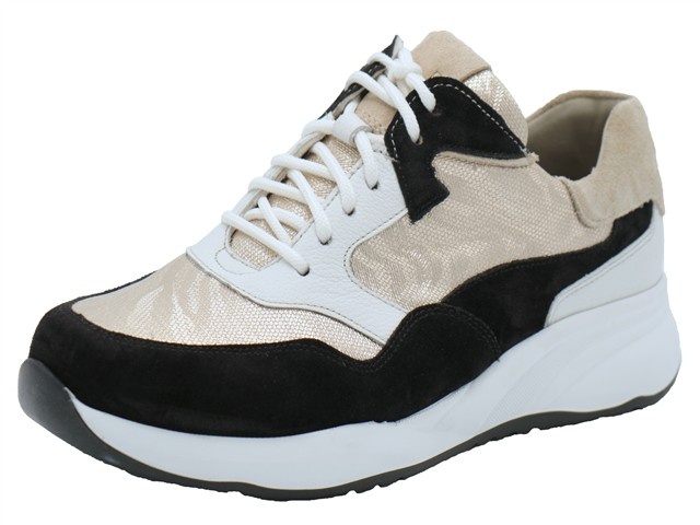 Durea sportieve en comfortabele dames sneaker. Deze veterschoen van Durea heeft als modelnaam Fleur en het artikelnummer is 6317-608-2064. De kleur is zwart/platin wit oftewel zwart met goud gecombineerd met een witte accenten in het suede leer in combinatie met mesh. Dit model van Durea kenmerkt zich door een combinatie van verschillende materialen. De voering is gemaakt van ademend en vocht absorberend materiaal (Dry Maxx), dat ook nog eens fluweel zacht aanvoelt. Daarnaast heeft dit model extra ruimte voor bij de tenen. De loopzool is extra licht en flexibel en zorgt daarnaast ook voor stabiliteit en grip. Verder geeft de zool een goede demping en door de oplopende neus wikkelt je voet tijdens het lopen als vanzelf af. De schoen heeft daarnaast een uitneembaar voetbed. De wijdtemaat is K, de schoen is dus geschikt voor bredere voeten.