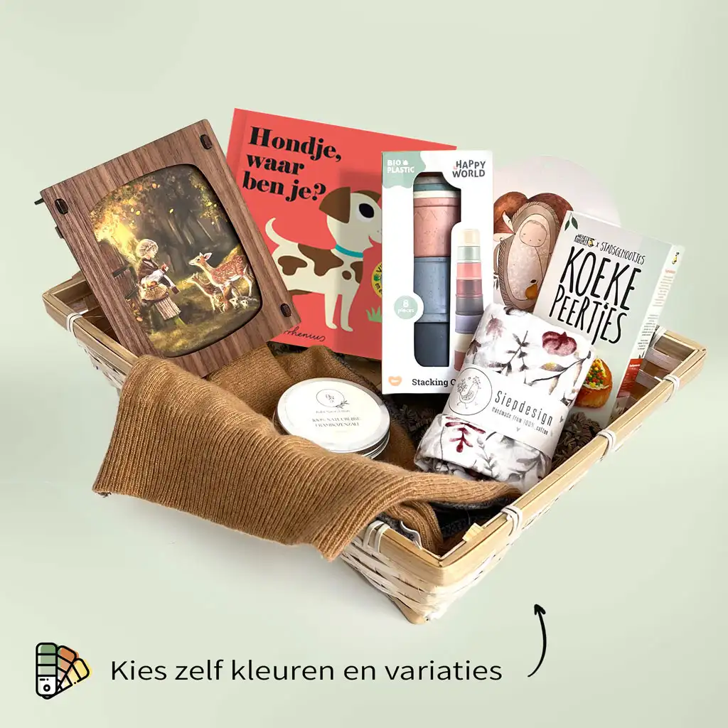 Duurzame kraammand 8 dagen groot Een nieuwe wereldburger verdient een warm welkom. Met de duurzame kraammand van Meneer Koekepeer geef je niet alleen een prachtig cadeau, maar draag je ook bij aan een betere wereld. Onze kraammanden zijn met zorg samengesteld, gevuld met duurzame en liefdevolle producten voor zowel de baby als de kersverse ouders. Dit is hét kraamcadeau waarmee je echt indruk maakt. Waarom een kraammand van Meneer Koekepeer? Het vinden van een origineel en duurzaam kraamcadeau kan een uitdaging zijn. Onze kraammanden bieden de perfecte oplossing: Duurzaam en bewust – We kiezen voor gerecyclede, herbruikbare of biologisch afbreekbare materialen. Geen overbodige plastic verpakkingen of wegwerpproducten. Voor iedere baby – Onze producten zijn genderneutraal en tijdloos. Geen standaard blauw of roze, maar stijlvolle neutrale tinten die overal bij passen. Tijdloze kwaliteit – We selecteren producten die lang meegaan. Van biologisch katoen tot handgemaakte accessoires: deze kraammand is een cadeau voor het leven. Met liefde samengesteld – Elk item is zorgvuldig gekozen en samengesteld in een prachtige mand die later hergebruikt kan worden voor speelgoed, luiers of verzorgingsproducten. Met een kraammand van Meneer Koekepeer geef je niet alleen een cadeau, maar een complete ervaring die ouders zich nog lang zullen herinneren. Hoe wordt deze kraammand verstuurd? Wij begrijpen hoe belangrijk het is dat jouw cadeau op tijd en in perfecte staat aankomt. Daarom besteden we extra zorg aan de verzending: Plasticvrij verpakt – Alles is verpakt in gerecycled papier of herbruikbare materialen. Snelle bezorging – Vandaag besteld, binnen enkele dagen bezorgd. Optioneel: een persoonlijke boodschap – Voeg een handgeschreven kaartje toe voor een extra persoonlijk tintje. Wil je een uniek, duurzaam en liefdevol kraamcadeau geven? Kies voor de Duurzame Kraammand 8 dagen groot en verras de kersverse ouders met een geschenk dat écht waarde heeft. Bestel vandaag nog Deze kraammand is een populair cadeau en vaak snel uitverkocht. Wil je liever een kraammand met 10 cadeaus ? Wacht niet te lang en bestel nu! Wat zit er in deze duurzame kraammand? De Duurzame Kraammand 8 dagen groot is een royale box vol verrassingen. Acht zorgvuldig geselecteerde cadeaus maken het kraambed een stukje aangenamer voor de ouders en hun baby. Wat kun je verwachten? Houten kaartenlampje Dit mooie houten kaartenlampje A6 voor ansichtkaarten met een vleugje licht is de perfecte toevoeging aan elke baby- of kinderkamer. Laat de schattige ansichtkaarten oplichten en transformeer de kamer in een oase van warmte en gezelligheid. Ansichtkaart kaartlampje Deze mooie ansichtkaart voor Kaartlampje van Nederlandse illustrator Iris Esther past geweldig in het houten kaartenlampje. De ansichtkaart is gedrukt op 350 grams milieuvriendelijk papier en heeft een prachtige matte coating om de illustratie te behouden. Geboortemuisjes Koekepeertjes Hoe kan een kraamfeest of babyshower beter gevierd worden dan met beschuit met Koekepeertjes!? Verras je kraambezoek met deze unieke vrolijke kleurtjes op een beschuitje! De inhoud van een pakje is 180 gram. Genoeg voor ongeveer 12 beschuitjes. Dit strooibeleg hebben onze huiskleuren: olijf, roest en oker. Deze kleuren staan voor ons voor tijdloos, natuurlijk en duurzaam. Cocoon inbakerzak Wolletje Een ‘Wolletje’ is een heerlijk warm alternatief voor een slaapzak of omslagdoek en het is handgemaakt van gerecyclede wollen truien. Een Wolletje is een handig, duurzaam alternatief voor een inbakerzak of slaapzak. Goed te gebruiken in de kinderwagen, (reis)wieg of om aan te trekken bij controles op het consultatiebureau. Siep Design Spuugdoekjes 2x De Siep Design 2 spuugdoekjes zijn van hydrofiele stof en Oeko-tex® 100 standard gecertificeerd. Ze zijn een musthave voor iedere ouder, de doekjes combineren functionaliteit met een trendy uitstraling, perfect voor dagelijkse babyverzorging. Happy World Stapelbekers De Happy World stapelbekers ‘Stacking Cups’ is gemaakt van bioplastic en bestaat uit rustige pastelkleuren. Bestaat uit acht verschillende stapelbekers van allemaal andere groottes. In sommige bekers bevinden ook gaatjes zodat ze als zeefje gebruikt kunnen worden tijdens het spelen in bad. Frambozenzalf blik 100ml Frambozenzalf is een verzorgende en hydraterende zalf voor zowel moeder als kind. Het is een natuurlijk product slechts bestaande uit shea butter en frambozenpitolie. Hondje, waar ben je? In ‘Hondje, waar ben je?’ zitten huisdieren verstopt achter de flapjes. De flapjes zijn gemaakt van vilt: lekker zacht én stevig dus! Een zoek-en-vind-boekje voor de allerkleinsten met een verrassing op de laatste pagina.