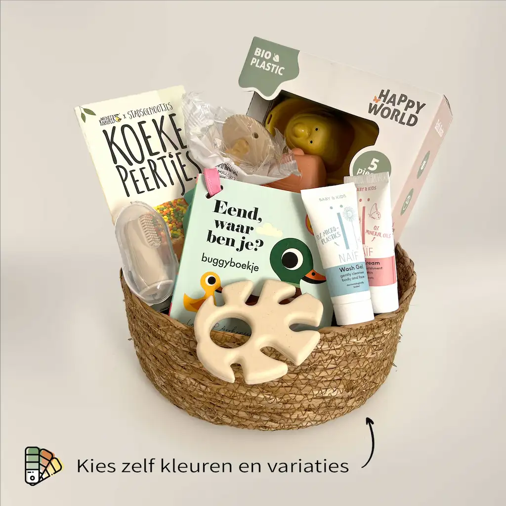 Duurzame kraammand 8 dagen klein Met de duurzame kraammand van Meneer Koekepeer geef je niet alleen een prachtig cadeau, maar draag je ook bij aan een betere wereld. Onze kraammanden zijn met zorg samengesteld, gevuld met duurzame en liefdevolle producten voor zowel de baby als de kersverse ouders. Dit is hét kraamcadeau waarmee je echt indruk maakt. Waarom een kraammand van Meneer Koekepeer? Het vinden van een origineel en duurzaam kraamcadeau kan een uitdaging zijn. Onze kraammanden bieden de perfecte oplossing: Duurzaam en bewust – We kiezen voor gerecyclede, herbruikbare of biologisch afbreekbare materialen. Geen overbodige plastic verpakkingen of wegwerpproducten. Voor iedere baby – Onze producten zijn genderneutraal en tijdloos. Geen standaard blauw of roze, maar stijlvolle neutrale tinten die overal bij passen. Tijdloze kwaliteit – We selecteren producten die lang meegaan. Van biologisch katoen tot handgemaakte accessoires: deze kraammand is een cadeau voor het leven. Met liefde samengesteld – Elk item is zorgvuldig gekozen en samengesteld in een prachtige mand die later hergebruikt kan worden voor speelgoed, luiers of verzorgingsproducten. Met een kraammand van Meneer Koekepeer geef je niet alleen een cadeau, maar een complete ervaring die ouders zich nog lang zullen herinneren. Hoe wordt deze kraammand verstuurd? Wij begrijpen hoe belangrijk het is dat jouw cadeau op tijd en in perfecte staat aankomt. Daarom besteden we extra zorg aan de verzending: Plasticvrij verpakt – Alles is verpakt in gerecycled papier of herbruikbare materialen. Snelle bezorging – Vandaag besteld, binnen enkele dagen bezorgd. Optioneel: een persoonlijke boodschap – Voeg een handgeschreven kaartje toe voor een extra persoonlijk tintje. Wil je een uniek, duurzaam en liefdevol kraamcadeau geven? Kies voor de Duurzame Kraammand 8 dagen groot en verras de kersverse ouders met een geschenk dat écht waarde heeft. Bestel vandaag nog Deze kraammand is een populair cadeau en vaak snel uitverkocht. Wacht niet te lang en bestel nu! Wat zit er in deze duurzame kraammand? De Duurzame Kraammand 8 dagen klein is een lieve box vol verrassingen. Acht zorgvuldig geselecteerde cadeaus maken het kraambed een stukje aangenamer voor de ouders en hun baby. Wat kun je verwachten? Happy World bio plastic badbootjes Vrolijke en duurzame bio plastic badbootjes van Happy World. Deze kleurrijke bootjes zijn speciaal ontworpen om de badtijd om te toveren tot een waar avontuur. Of je ze nu in bad, aan het strand, in het zwembad of in de zandbak gebruikt, deze badbootjes zorgen altijd voor eindeloos speelplezier. Eend, waar ben je? – buggyboekje Dit kartonne buggyboekje is handig voor onderweg. Onder de flapjes van dit boek zitten allerlei kleine beestjes verborgen, zoals een bij, een rups en een lieveheersbeestje. Extra leuk is dat de flapjes van vilt zijn gemaakt: lekker handig én stevig dus! Bijtblad van siliconen Met dit bijtblad van siliconen in de vorm van een monstera blad helpt je baby bij doorkomende tandjes. Het bijtblad heeft zachte uitsteeksels met verschillende structuren die een zachte massage geven aan het tandvlees. Bovendien is hij ontworpen om makkelijk vast te pakken, perfect voor kleine handjes! Natuurlijk is het bijtblad volledig BPA-vrij en veilig voor je kindje. Frigg speen rope Natuur rubberen speen. Deze speen heeft een nieuw design, maar nog wel zo neutraal mogelijk. Deze speen is speciaal voor baby’s in de leeftijdcategorie van 0 tot 6 maanden. Naif mini tube Bath Foam 30ml De bath foam zorgt er voor dat jouw baby’s huidje zacht en glad aanvoelt. Het prikt niet in de ogen en is gemaakt van katoenzaad extract en glutenvrije tarwe proteïne. Omdat de wasgel gemaakt is met een allergeenvrije parfum heeft het een heerlijke frisse geur. Naif mini Body Lotion 30ml De bodylotion van Naïf bevat allergeenvrije parfum waardoor de lotion heerlijk ruikt maar nog steeds veilig is. De lotion is goed te gebruiken voor de extreem droge huid en eczeem en is dagelijks te gebruiken. Siliconen tandenborstel Siliconen tandenborstel van Rammelaartje is gemaakt van 100% food grade siliconen en is hierdoor veilig om op te kauwen en mee te poetsen. Deze tandenborstels zijn over jouw vinger te schuiven waardoor je gemakkelijk alle doorkomende tandjes van de baby kan poetsen. Geboortemuisjes Koekepeertjes Hoe kan een kraamfeest of babyshower beter gevierd worden dan met beschuit met Koekepeertjes!? Verras je kraambezoek met deze unieke vrolijke kleurtjes op een beschuitje! De inhoud van een pakje is 180 gram. Genoeg voor ongeveer 12 beschuitjes. Dit strooibeleg hebben onze huiskleuren: olijf, roest en oker. Deze kleuren staan voor ons voor tijdloos, natuurlijk en duurzaam.
