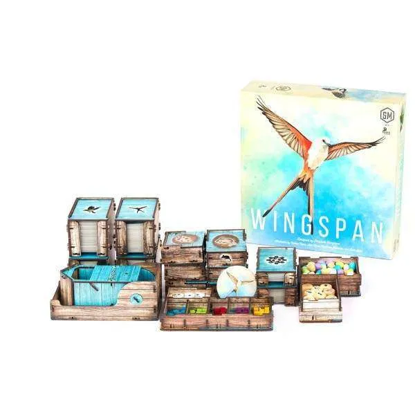 e-Raptor Wingspan + expansions UV Print e-Raptor Insert compatible with Wingspan + expansions UV Print (Europe and Oceania) is your must-have accessory designed to organize and improve the experience of the gameplay.Thanks to our insert you can arrange all game components and sleeved cards to keep them in order – no more mess on the table while playing. No more looking for necessary elements during the game.Moreover, when the box is closed, the components are still kept in order, ready for setting another game faster than ever!The insert is durable and made of high-quality HDF. To assemble it, there is no glue required. It allows you to hold all components inside the box. You can see the suggested components setup in the pictures.Insert designed for game with external box dimensions of 29.4 x 29.4 x 7.6 cm.
