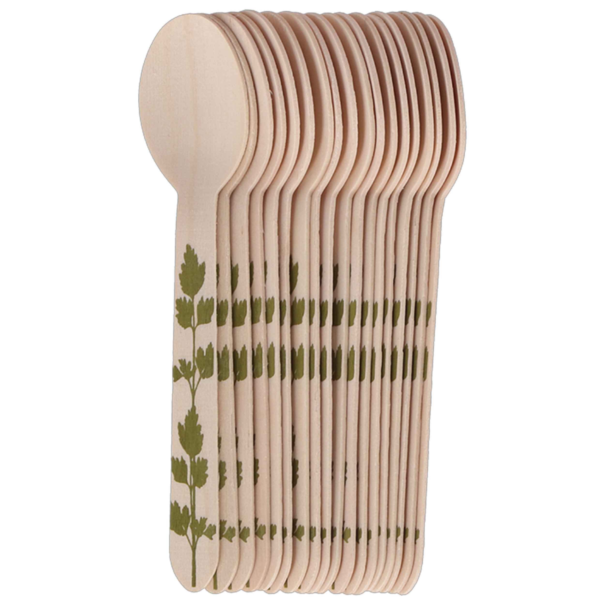 Lepels van hout met kruidenopdruk. Deze set houten Lepels is perfect voor feestjes, picknicks, barbecues of een gezellige campingmaaltijd. De Lepels zijn bedrukt met een vrolijke kruidenopdruk, wat zorgt voor een natuurlijke en frisse uitstraling op tafel. Gemaakt van FSC 100% hout, een milieubewust alternatief voor plastic wegwerpbestek. Handig in gebruik, stijlvol om te zien en ideaal voor elk buitenmoment!