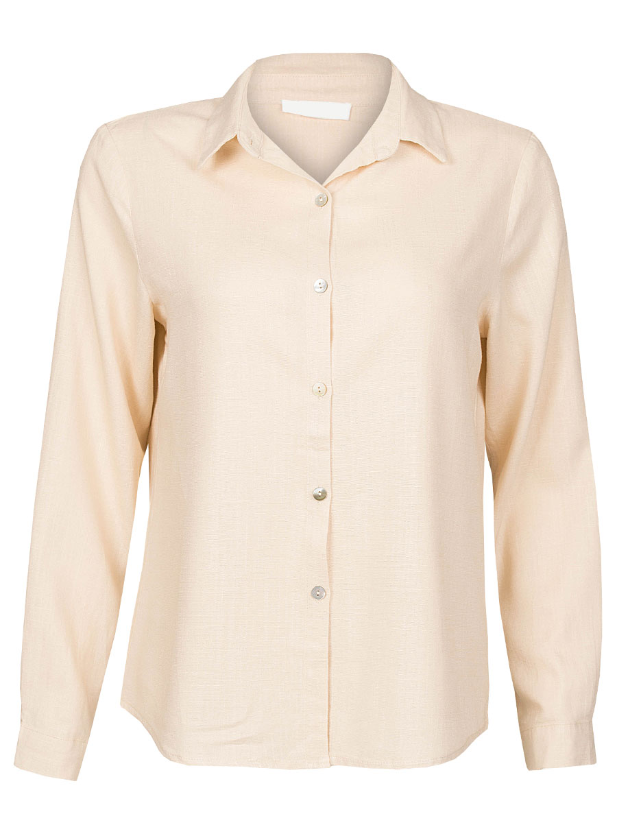 Deze beigekleurige blouse heeft een mix van katoen en linnen.