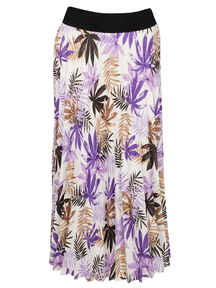 Deze plooirok heeft een mooie bruine met lilakleurige bladerenprint en elastische tailleband.