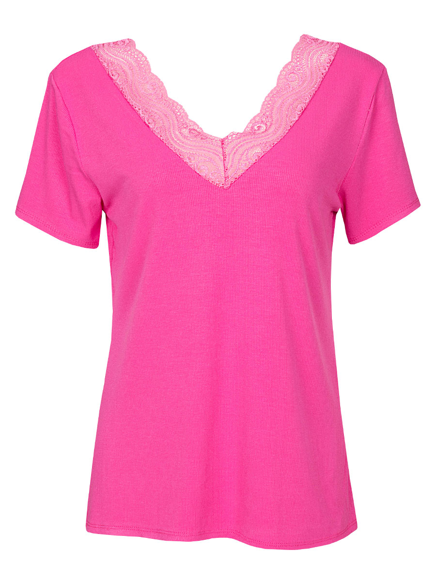 Dit roze shirt met v-hals heeft een mooie kanten rand aan de voor- en achterkant. Het shirt heeft een fijne ribbel en draagt heerlijk door zijn viscose en stretch.