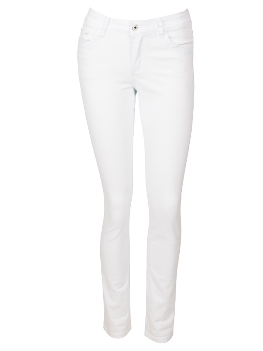 Details: stretch, 5 pocket model, leuk bewerkt bij de zakken