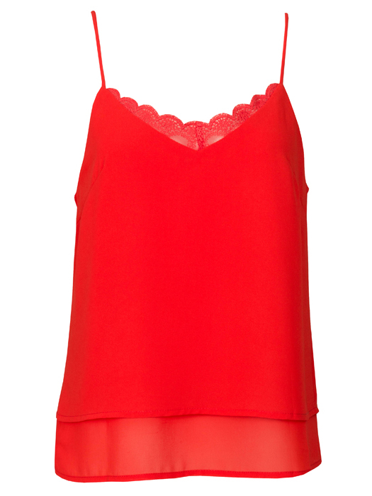 Deze rode top heeft een mooie kanten randje van boven (voor en achter). De top is ook dubbellaags waarbij de onderste laag er een stukje onder uit komt. De top staat erg chique onder een blazer maar ook super mooi onder een vest. Je kunt er eindeloos mee combineren.