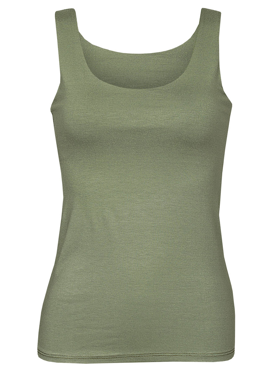 Deze mooie kwaliteit armykleurige top met brede bandjes en ronde hals draagt heerlijk door zijn viscose en stretch. Het bovenstukje is dubbel gevoerd voor extra stevigheid.