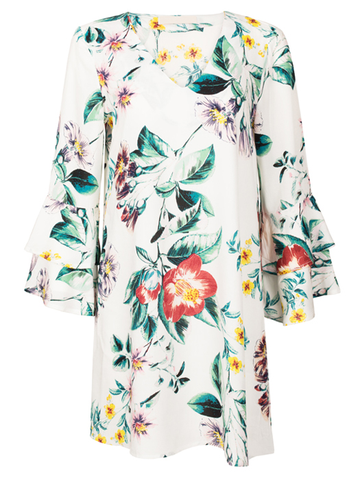 Details: bloemmotief, trompetmouwen, draagbaar als tuniek en jurk