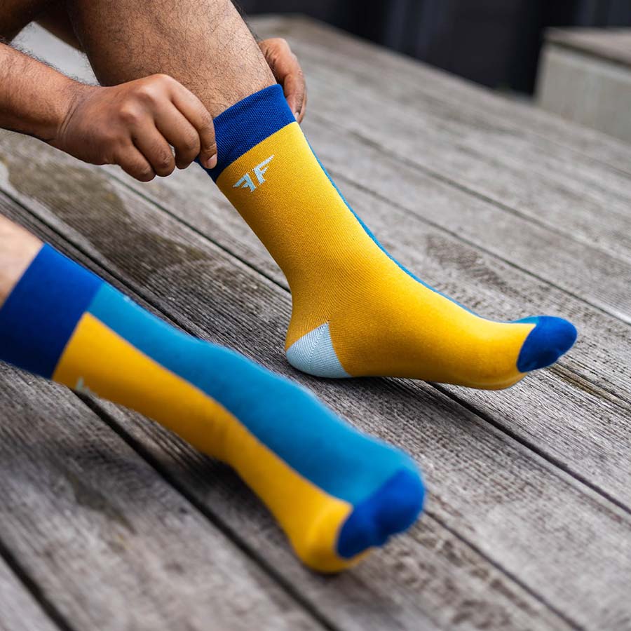 De Twist herensokken hebben een opvallend design waarbij de linker- en rechtersok net even anders zijn. De combinatie van zachte kleuren en felle accenten maakt ze uniek. Door het ademende katoen zitten ze lekker en blijven je voeten fris.