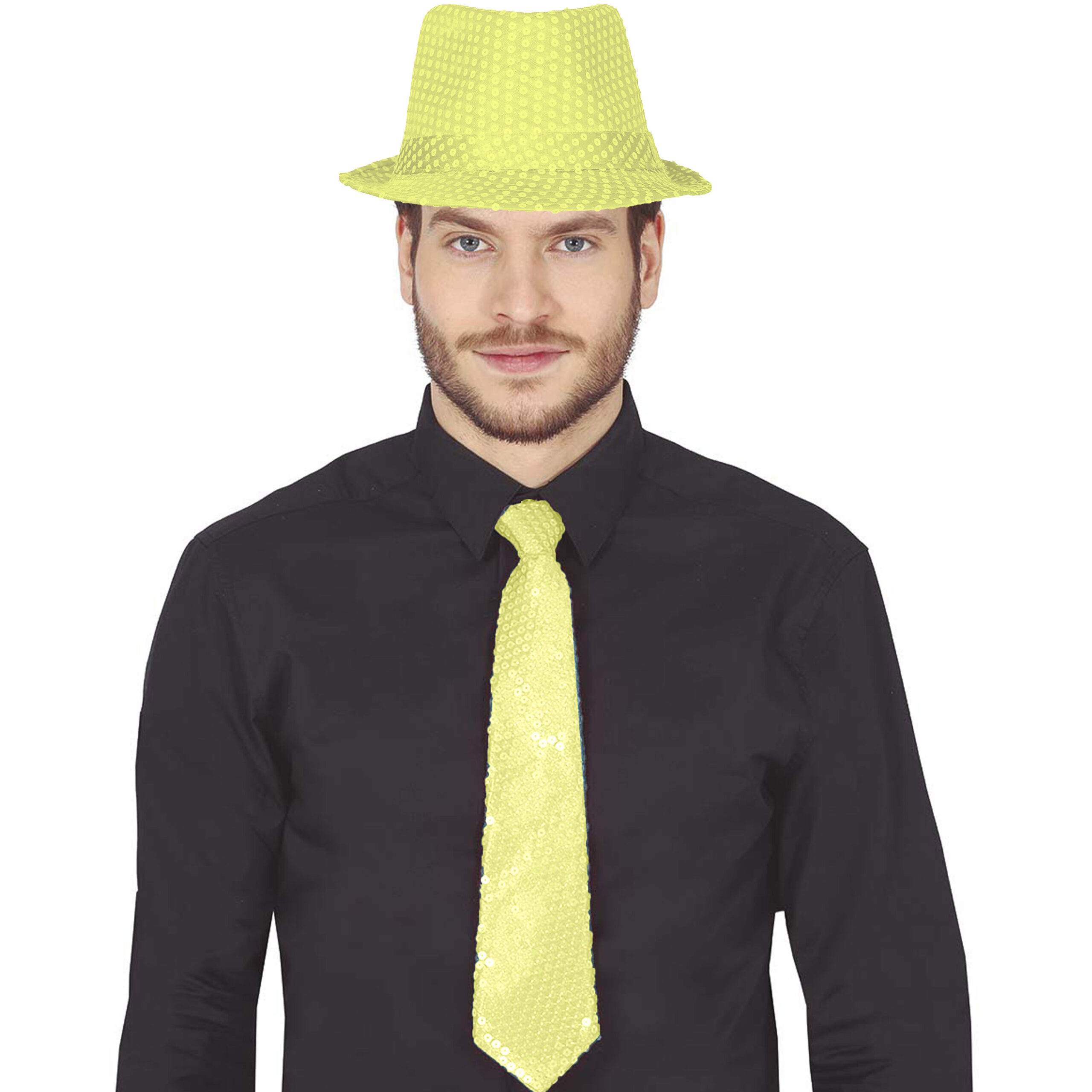Carnaval verkleed stropdas en hoed – neon geel – pailletten – volwassenen – verkleed accessoires — Fiestas Guirca