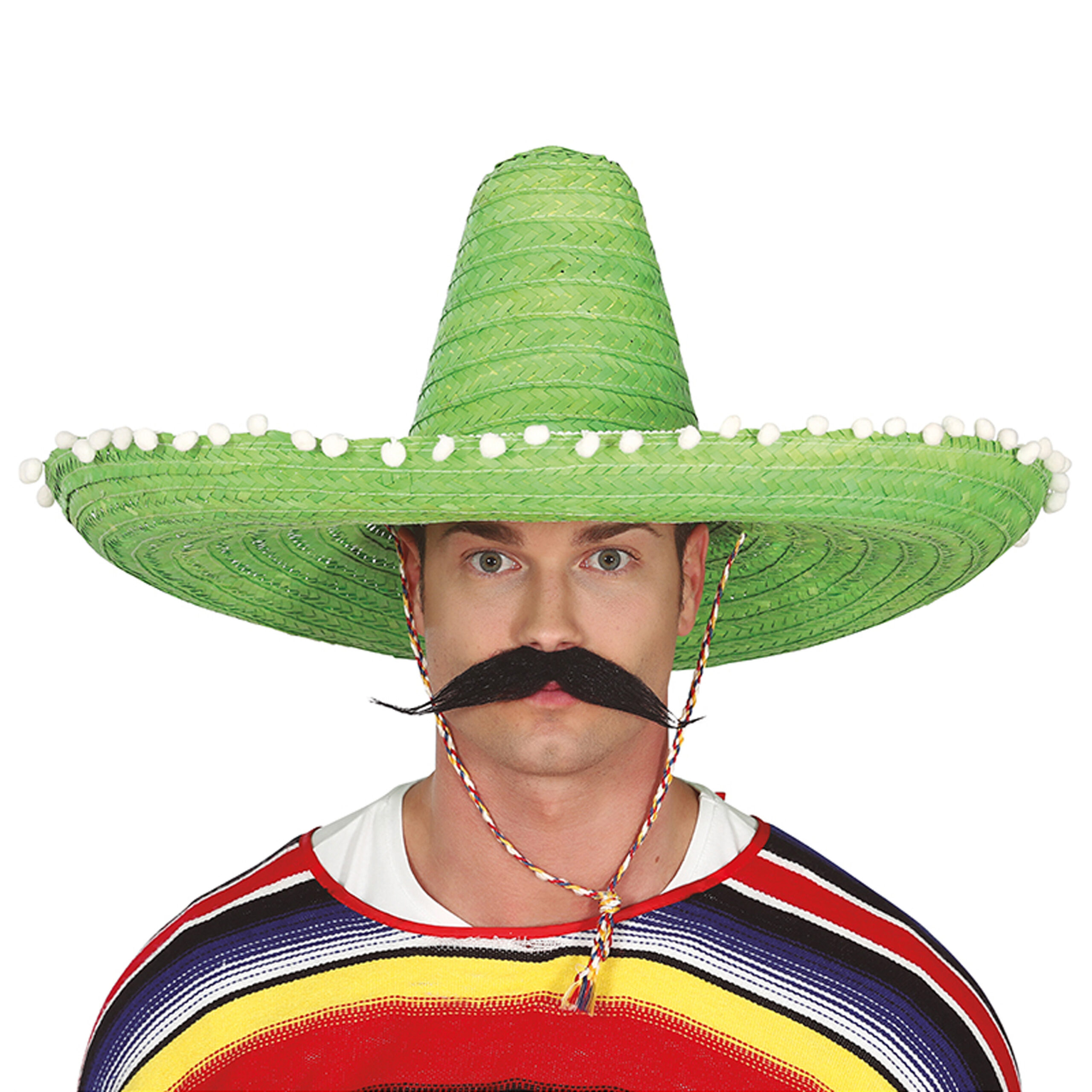 Mexicaanse sombrero hoed met mooie ornamenten/details voor heren, in de kleur groen, gemaakt in een one size model maat 59 cm. Breedte is 60 cm. Mexicaans, wilde westen en western verkleed thema. Verkleedkleding artikelen voor carnaval en thema feestjes. Hoeden/petjes/hoofddeksels. Materiaal: stro.