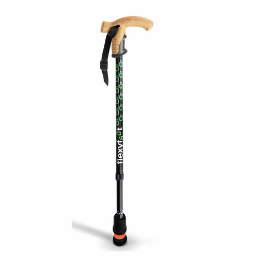 Flexyfoot wandelstok Zwart met kurken handvat. Verstelbare in hoogte van 70 tot 96 cm aluminium wandelstok met een handvat gemaakt van kurk. Het kurken handvat is ademend en heeft een verkoelende werking. Hierdoor ontstaat er altijd een goede en comfortabele grip wordt de belasting op de gewrichten sterk geminimaliseerd en ervaart de gebruiker een verhoogd comfort tijdens het lopen.