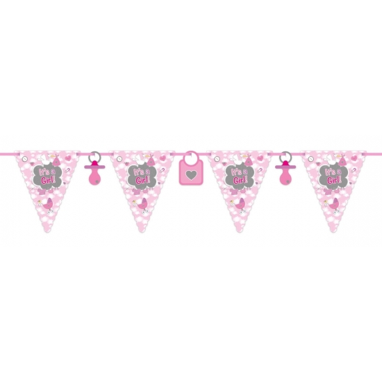 De vlaggetjes zijn enkelzijdig bedrukt met de vrolijke tekst ?It?s a Girl?, versierd met ooievaars en andere feestelijke accenten. Perfect om de woonkamer, tuin of feestzaal te versieren en meteen een feestelijke sfeer te cre?ren.