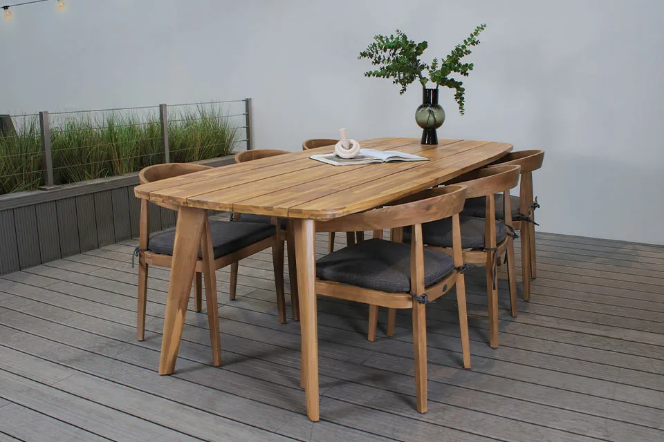 Introductie Fonteyn | Tuinset Sanjo-RixosHet Fonteyn | Tuinset Sanjo-Rixos van Fonteyn transformeert jouw buitenruimte tot een elegante eetplek waar comfort en stijl samenkomen. Deze complete tuinset bestaat uit een rechthoekige teakhouten tafel met zes bijpassende stoelen, elk voorzien van comfortabele donkerblauwe kussens. Het natuurlijke teakhout straalt warmte uit en creëert een gastvrije sfeer voor elke gelegenheid in jouw tuin of op het terras.nnTijdloze elegantie voor jouw buitenruimteTeakhout geeft jouw tuin een verfijnde en natuurlijke uitstraling die perfect past bij elke stijl. De horizontale planken van het tafelblad tonen de karakteristieke houtstructuur met warme, gouden tinten die een gevoel van luxe uitstralen. De A-vormige stoelpoten combineren moderne vormgeving met klassieke elegantie, waardoor deze set een eyecatcher wordt in elke buitenruimte. Het donkerblauwe kussenmateriaal vormt een prachtig contrast met het warme teakhout en voegt een touch van kleur toe aan je terras.nnPerfecte functionaliteit voor gezellige momentenDe ruime rechthoekige tafel biedt voldoende plaats voor zes personen en creëert de ideale setting voor familiedinners, barbecues of ontspannen borrels met vrienden. Elke stoel beschikt over een ergonomisch gevormde rugleuning die optimaal comfort biedt tijdens lange tafelgesprekken. De stabiele constructie zorgt ervoor dat iedereen comfortabel zit, terwijl het royale tafelblad ruimte biedt voor servies, decoraties en al jouw favoriete gerechten.nnZorgeloos genieten van buitenlevenTeakhout staat bekend om zijn gebruiksgemak en lage onderhoudsbehoefte, waardoor je extra tijd hebt om te genieten van je buitenruimte. De natuurlijke oliën in het hout beschermen tegen weersinvloeden en maken regelmatig behandelen overbodig. De afneembare kussens laten zich eenvoudig reinigen en opbergen, terwijl het gladde tafeloppervlak moeiteloos schoon te maken is na elk gebruik. Deze praktische eigenschappen maken elke buitenmaaltijd tot een ontspannen ervaring.n