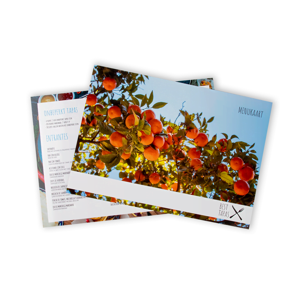 Bij Fotofabriek maak je eenvoudig een liggende A4 menukaart. Ideaal voor een bijzonder diner bij een bruiloft, een huwelijksjubileum of kerst met de familie. Kies uit verschillende ontwerpen. Gelamineerde afwerking; gemakkelijk schoon te houden. Eigen foto’s, logo’s en teksten toevoegen. Volumekorting bij hogere oplage. 300 grams papier. Als eigenaar van een restaurant is het een ideale mogelijkheid om een eigen menukaart te maken in plaats van een standaard ontwerp te gebruiken. Voeg je eigen foto’s, van het restaurant en/of gerechten, toe en maak een prachtige en professionele menukaart. De menukaart is eenvoudig te maken met onze gratis software.