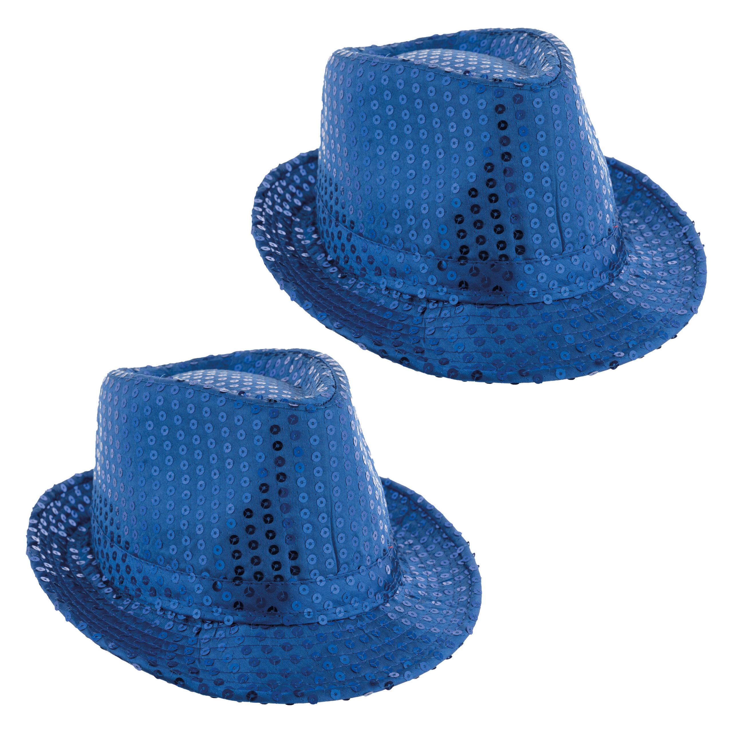 2x party glitter pailletten Trilby hoedje in de kleur blauw. Maak je carnavaloutfit compleet met dit opvallende rode trilby hoedje, bedekt met schitterende glitter pailletten! Of je nu gaat voor een chique of stoere look, dit hoedje voegt gegarandeerd wat extra sparkle toe aan je feestoutfit. Het lichtgewicht polyester zorgt voor een comfortabel draaggevoel, zodat jij zonder zorgen kunt shinen op elk carnaval feest. Laat de glitterregen beginnen, met dit hoedje ben jij de ster van de nacht!