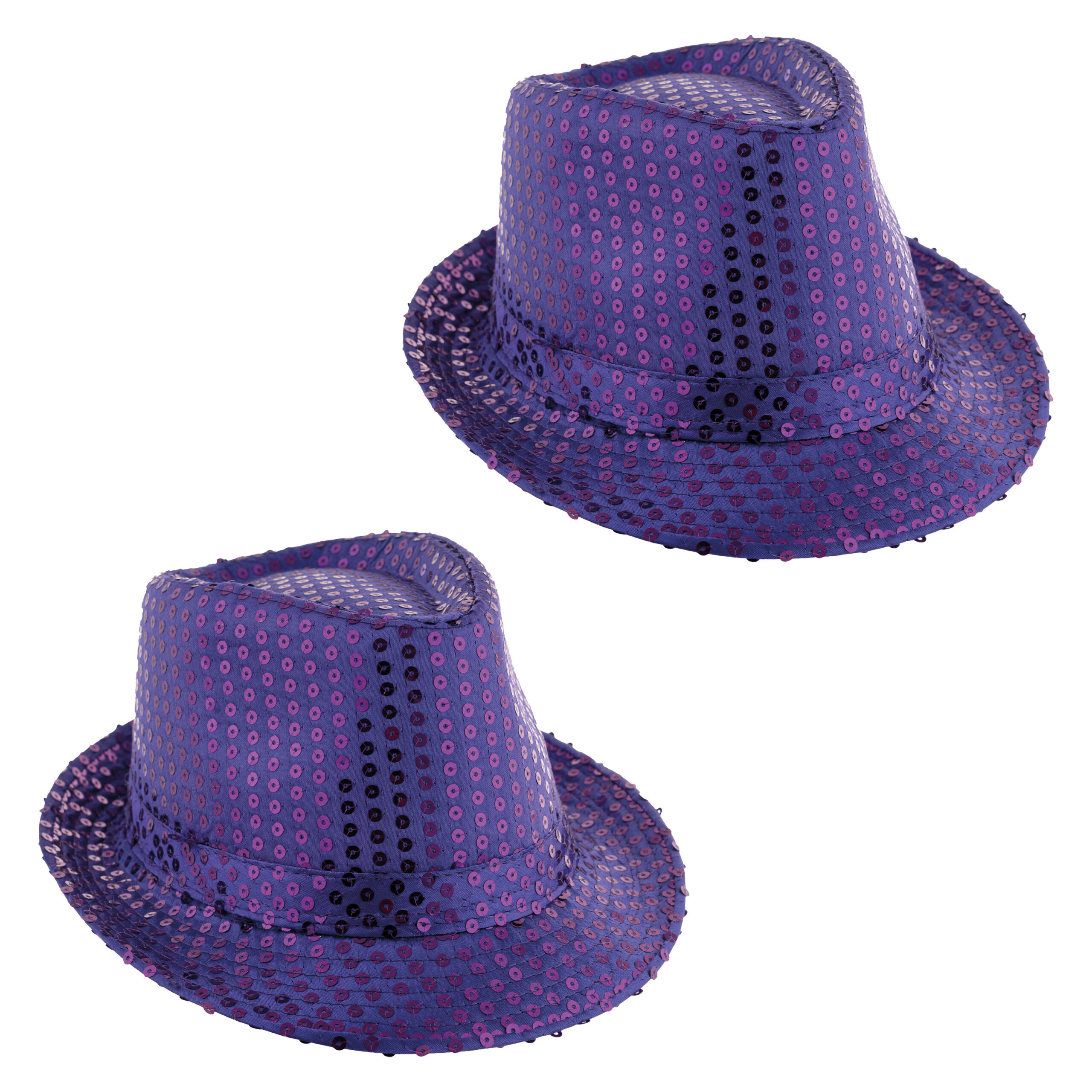Carnaval verkleed hoedje – 2x – Trilby – paars – glitter pailletten – heren/dames – Carnaval — Funny Fashion