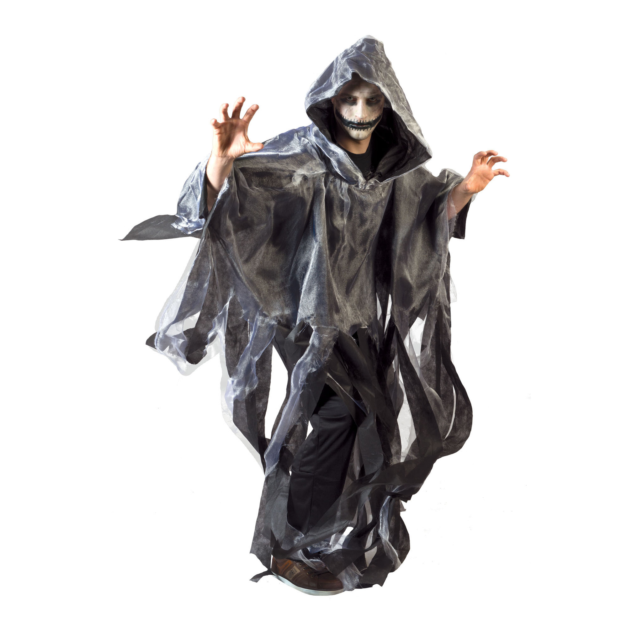 Funny Fashion Halloween/carnaval verkleed cape/gewaad met kap voor over het hoofd in de kleur Grijs. Gemaakt van polyester stof voor volwassenen. One size model. Carnaval kostuum/kleding. Vergeet ook de verkleed accessoires niet. Verkleedkleding mantels en capes. Ga verkleed als geest, spook, demoon, monster, killer, etc.