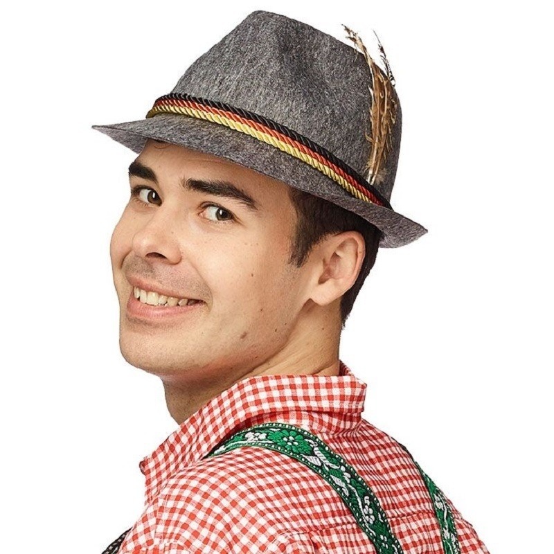 Grijs Duits Tiroler hoedje verkleedaccessoire voor volwassenen. Tiroler/bierfeest/Oktoberfest feesthoedje in gemeleerd grijs met koord, in de kleuren van de Duitse vlag, rondom en een veren detail. Materiaal: vilt, polyester, echte veren. Maat: one size, past tot hoofdmaat 58 (cm). Voordelige Beieren/Beierse bierfeest Anton aus Tirol/Heidi apres ski verkleedartikelen voor dames/heren/volwassenen. Duitsland jagershoedje/alpenhoedje. Ook geschikt als supporter/fan hoedje voor tijdens het EK of WK. Let op: dit is een verkleedaccessoire voor volwassenen, geen speelgoed.