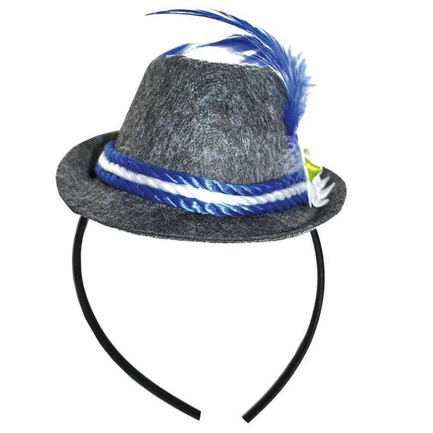 Tiara met Tiroler hoedje. Leuke tiara met een grijs Oktoberfest hoedje met blauw en witte veer. Let op: dit is een verkleedaccessoire voor volwassenen, geen speelgoed.