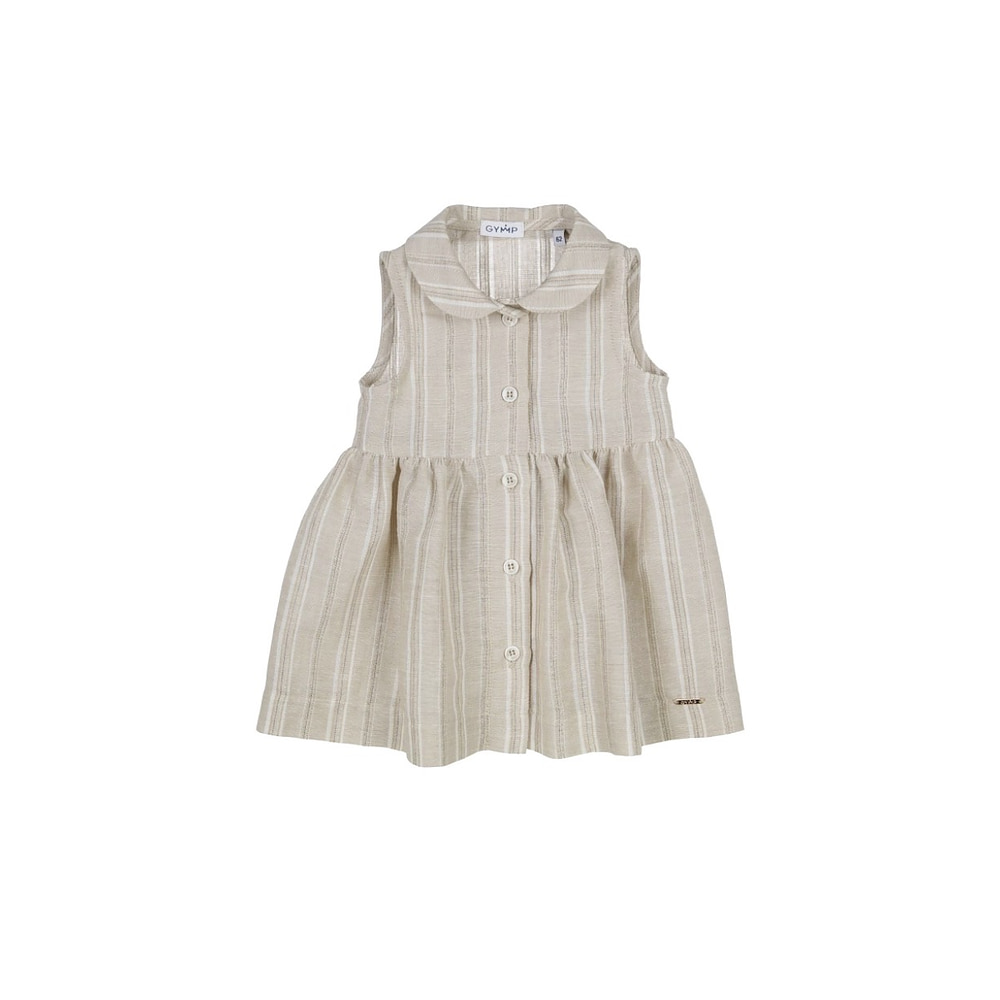 Gestreepte jurk van Gymp. De jurk sluit aan de voorkant met knoopjes. Mooie rustige kleuren zoals beige, creme en heel subtiel een goudkleurig streepje. Evt een tshirtje korte of lange mouw eronder combineren.