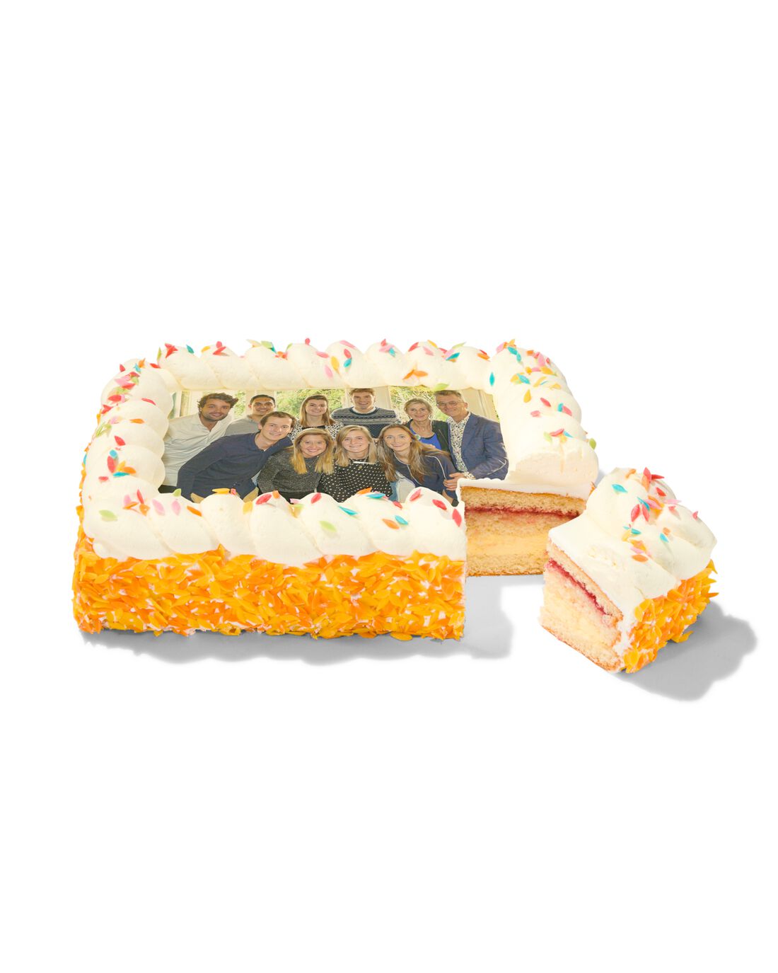 Mooie momenten wil je vastleggen en vieren. De HEMA fototaart doet daar nog een schepje bovenop, voor als je herinneringen zo leuk zijn dat je ze wel óp zou willen eten. De fototaart bestaat uit een luchtige cake met banketvulling, frisse kersen rodebessenjam, kleurrijke druppels en jouw foto of tekening, tekst en slagroom. Mis je alleen nog decoratiesnippers om de taart helemaal af te maken? Nee hoor! Die krijg je er van ons in een zakje bij. De fototaart met gekleurde druppels is geschikt om er met wel 16 personen van te eten.