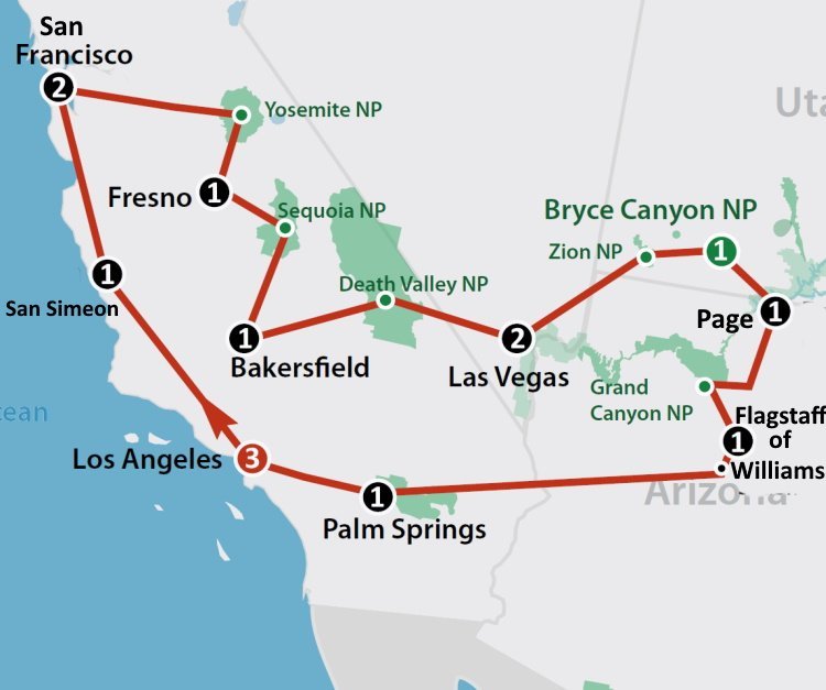 Een rondreis door West-Amerika van 16 dagen: de beste manier voor wie dit deel van Amerika echt wilt leren kennen. De autorondreis begint met een rit over de Highway 1 van Los Angeles naar San Francisco. Tijdens de reis door het zuidwesten van de VS ziet u uiteraard hoogtepunten als de Grand Canyon, Bryce Canyon, Zion National Park en het diepblauwe Lake Powell. Maar ook bezoekt u uiteraard het bekende Yosemite National Park. Ook de ‘glitter and glamour’ van Las Vegas en Los Angeles ontbreken niet op het programma. Een geweldige roadtrip voor wie in korte tijd de beste hotspots en bezienswaardigheden van West Amerika wil zien. Boek dus snel de autorondreis Highlights of the West en ontdek alle hoogtepunten van West-Amerika!