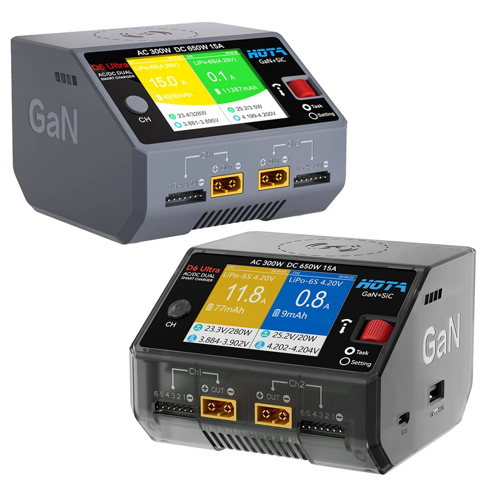 Specificaties:Merk: HOTAModel: D6 UltraIngangsspanning: AC 100~240V / DC 6.5~30VLaadstroom: 0,1~15A x 2Laadvermogen: DC 325W x 2 (@ invoerv spanning > 24V), AC 300W (ondersteunt stroomverdeling)Ontladingsvermogen: Interne ontlading: 15W x 2 (Balanspoort 10W x 2),Externe ontlading: 325W x 2 (650W)Batterijtype: LiHv/LiPo/LiFe/Lilon/Lixx: 1~6SNiZn/NiCd/NiMH: 1~16SSlimme Batterij: 1~6SLoodzuur (Pb): 1~12S (2~24V)Eneloop: 1~16SBalans Huidig: 1600mA x 2Ontlaadstroom: 0,1~3A x 2Extern afvoerstroom: 1~15A x 2USB-uitgang: 5V / 2.1AOpslagtemperatuur: -20 ~ 60°CBedrijfstemperatuur: 0~40°CSchermgrootte: 2,8″ 320×240 260.000 kleurenAfmetingen: 108mm x 105mm x 76mmNetto gewicht: 575gPakket inbegrepen:1 x HOTA D6 Ultra Acculader1 x EU of US of UK voedingskabel