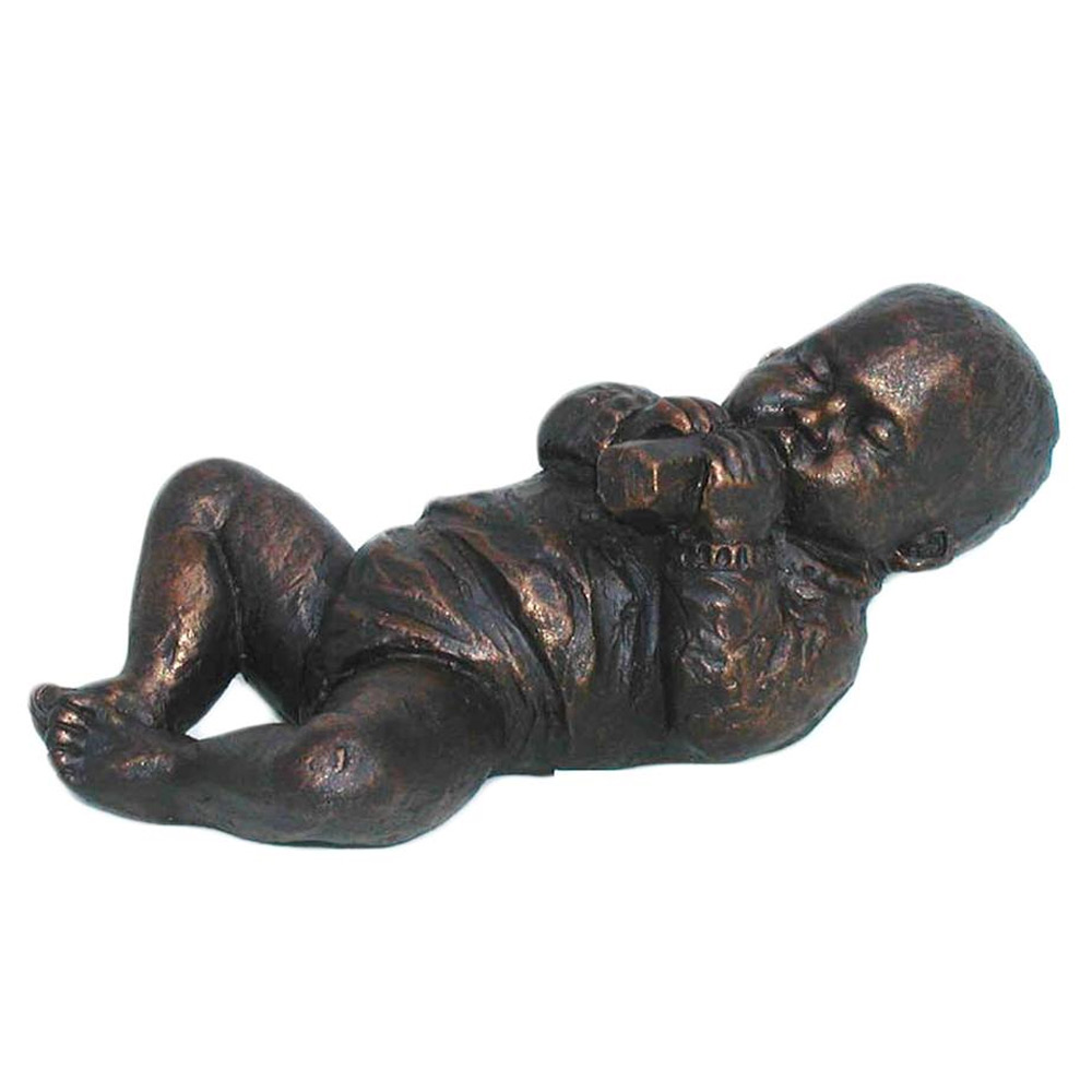 Lief beeldje van een liggend kindje met een flesje. Het beeld van het babytje is gemaakt van neoliet. Dit materiaal is vorst- en waterbestendig. Hierdoor is het ideaal voor buiten!-Breedte: 18 cm