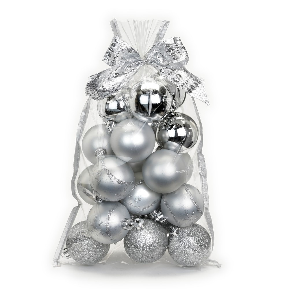 20x stuks kunststof kerstballen zilver mix 6 cm. Giftbag met een mix van glans/glitter/gedecoreerde kerstballen.