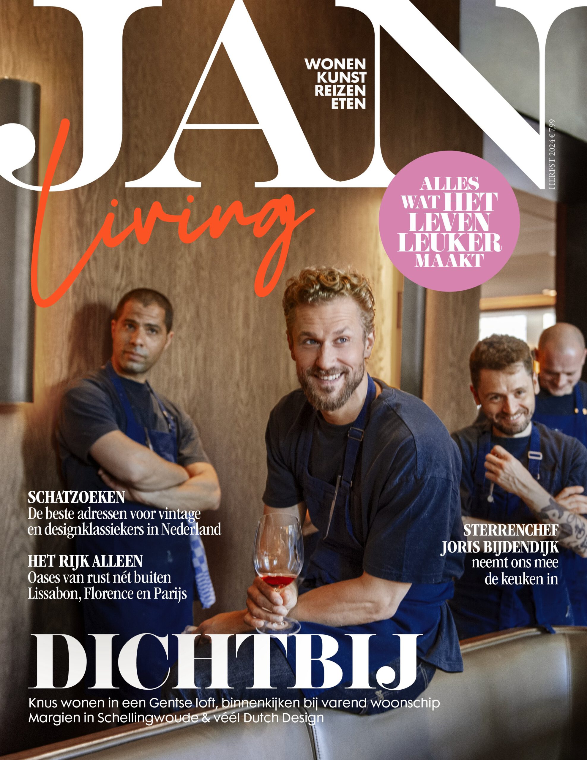 Voor dit herfstnummer nam niemand minder dan de aanstekelijk energieke sterrenchef Joris Bijdendijk ons mee zijn keuken(s) in – bij RIJKS, Wils én thuis – voor een kijkje behind the scenes in zijn drukke, inspirerende leven.Naast een kijkje in de keuken bij Joris, kijken we binnen in de stijlvolle Gentse loft van architect Veerle Van de Walle en in het knusse varende woonschip Margien in Schellingwoude. We struinen langs de beste adressen van Nederlandse loodsen, markten, kringloopwinkels en pop-ups waar je vintage en designklassiekers scoort.Wie zin heeft in een najaarsreset vindt in deze JAN Living bovendien 3 heerlijke oases van rust nét buiten de stadsdrukte van Lissabon, Florence en Parijs, 7 hartverwarmende herfstrecepten van Nina Olsson, de favorieten van Romy Boomsma én last but not least: JAN’s eigen Give a Pon-pantoffels!