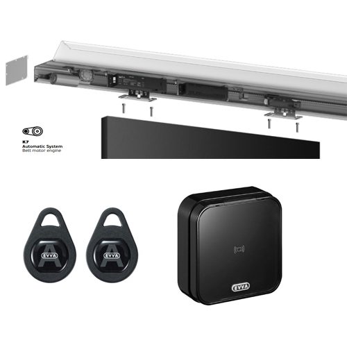JNF K7 schuifdeurrail set , automatich systeem , snaar aangedreven, met airkey wandlezer opbouw en 3 sleutelhanger tags, rail lengte 3000 mm, deurbreetde max 1300 mm, deurgewicht 150 kg. Meer info →
