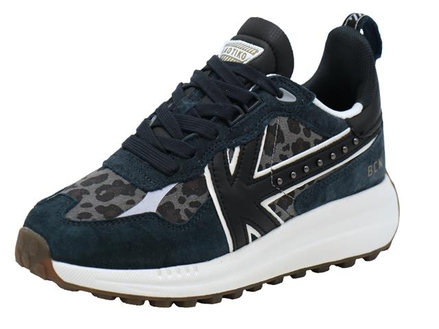 Kaotiko hippe en trendy damessneaker. Deze veterschoen van Kaotiko heeft als modelnaam Detroit glam en het artikelnummer is: AR002-03-2700. De kleur is anthracite oftewel grijs met donkerblauw gecombineerd in het suede met een panterpint en stoere studs. De voering is van textiel met een uitneembaar voetbed.