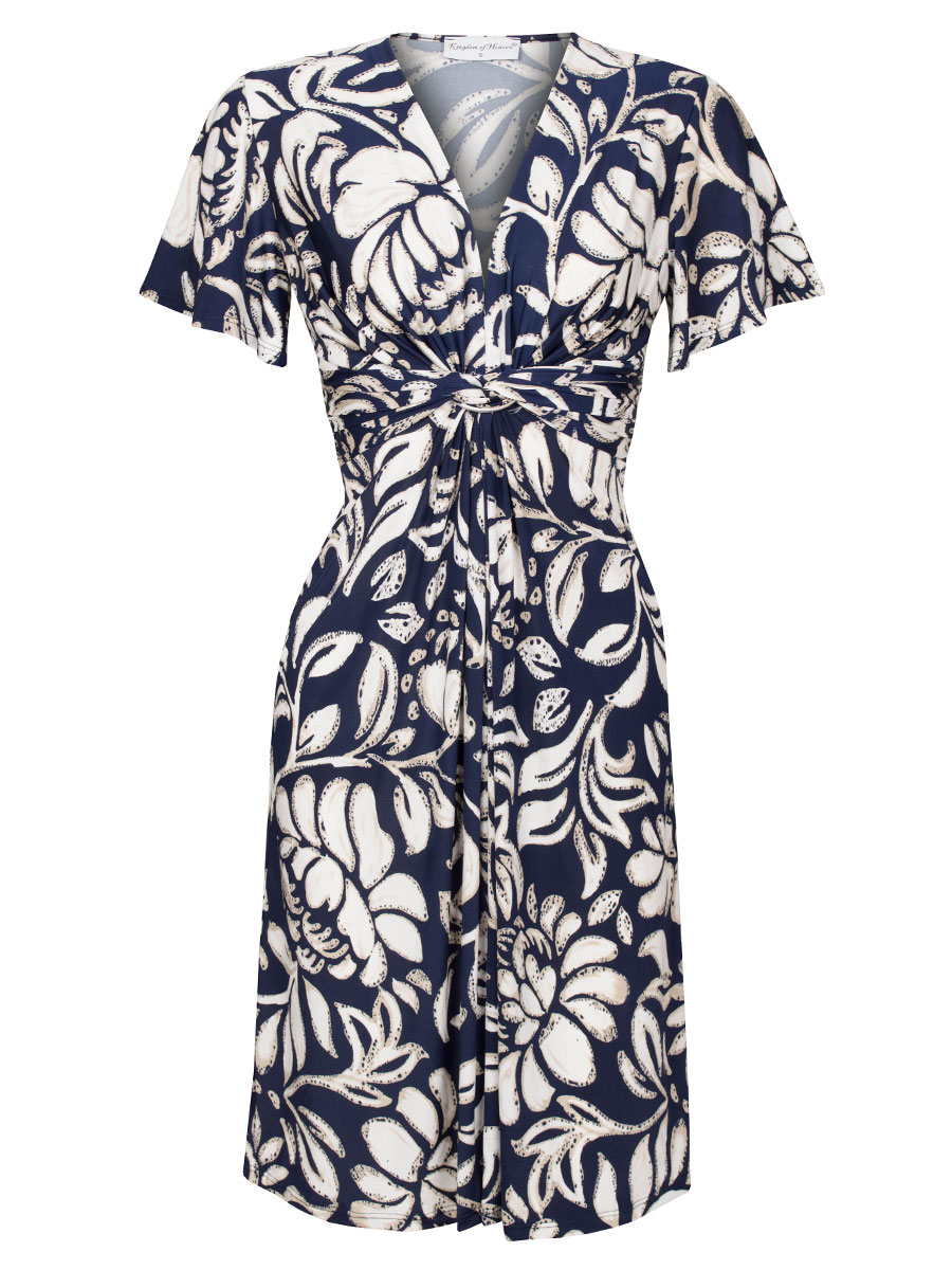 Deze prachtige navykleurige jurk met bloemenprint is ideaal voor een feest, bruiloft of andere gelegenheid. De jurk van het merk Kingdom of Heaven