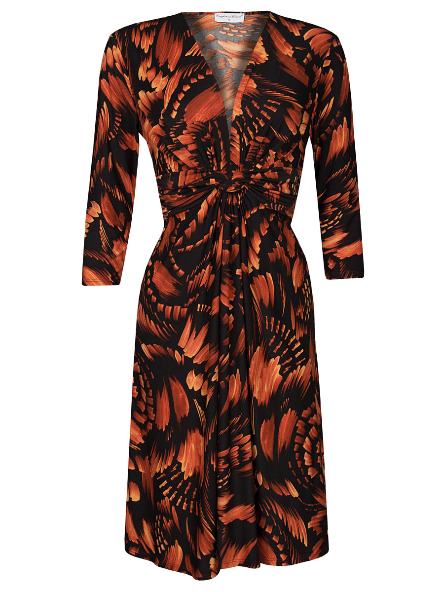 Deze zwarte jurk met mooie bruine print van het merk Kingdom of Heaven met 3/4 mouwlengte ziet er elegant uit. De jurk valt mooi door de stretch en de plooiingen bij de borst en middenvoor die een speels effect geven en meer ruimte als dat nodig is. Een vast ceintuur die je aan de achterzijde strikt geeft de finishing touch aan deze fraaie jurk. Deze jurk is van het model “Elegant” en uitgevoerd in de kortere standaard lengte van dit model.