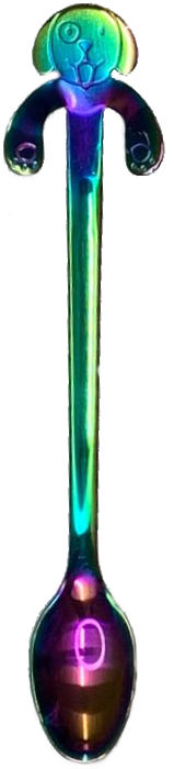 Uitstekende pootjes waardoor die makkelijk op een glas of dunne beker past.Gelegeerd staal met regenboog look.Afmeting: Lengte 154 mm.