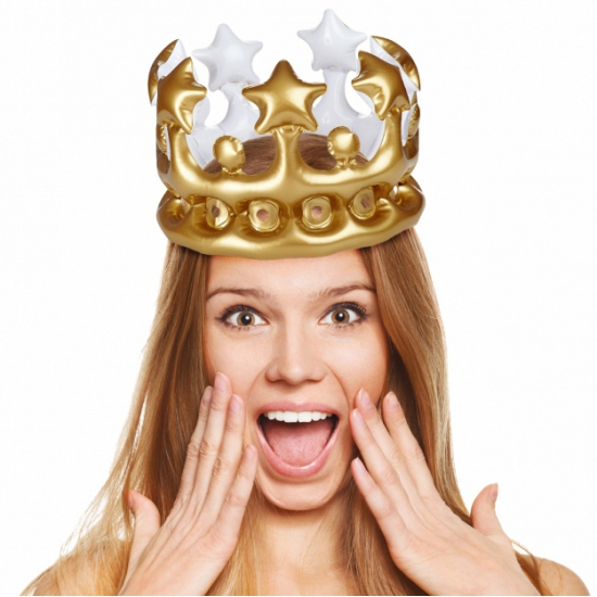 Opblaasbare verkleedartikel kroon, in het goud, van 23 cm. Koning of koninging voor een dag met deze leuke opblaasbare kroon van ongeveer 23 cm breed en 18 cm hoog. Carnaval artikel.