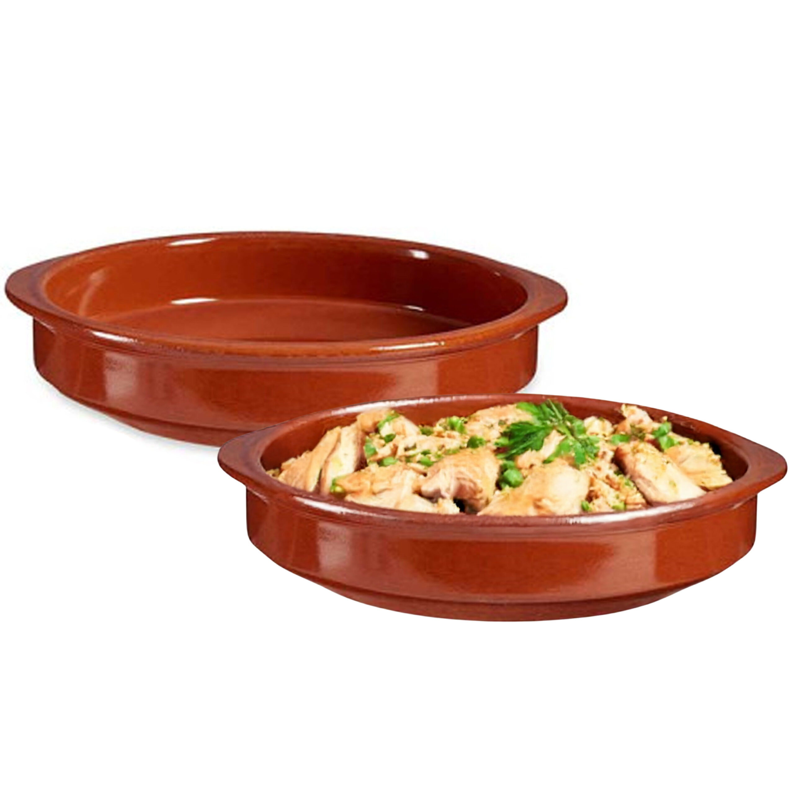 Bekijk product bij Bellatio.nl — bestel vandaag nog en ontvang de Tapas ovenschaal / serveerschaal – 2x – rond – Spaans terracotta/aardewerk – D38 x H8 cm snel thuis.