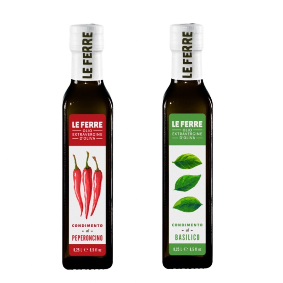 Deze olijfolie bundel bevat 2 verschillende soorten olijfolie van Le Ferre. In de bundel zit een fles olijfolie basilicum en een fles olijfolie pepertjes. Een mooie combinatie die je voor veel gerechten kunt gebruiken. Vandaar dat dit ook een van de populairste olijfolie combinaties is. De olijfolie van Le Ferre is een Italiaanse olijfolie van de beste kwaliteit. De olijfolie is gemaakt van olijven uit Puglia en op smaak gebracht met Italiaanse basilicum en met Italiaanse pepertjes. Doordat deze olijfolie gemaakt is van verschillende soorten Italiaanse olijven, heeft de olie een licht bittere en een aangename kruidige smaak. De olijven worden handmatig geplukt in september en oktober. In deze fles olijfolie zit 0,25L olijfolie die al je gerechten extra smaak geeft. De dop is geseald waardoor de versheid gewaarborgd blijft. De olijfolie kun je gebruiken voor het aanmaken van een heerlijke salade, pasta, vlees en vis. Een veelzijdige olie die je voor al je favoriete pasta gerechten kunt gebruiken.