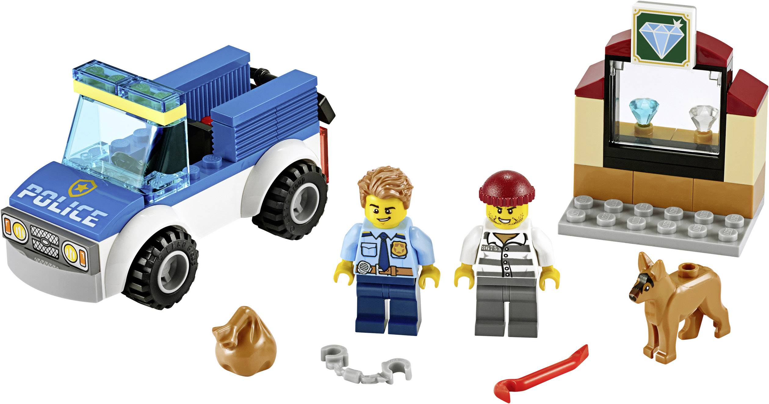Oh nee! Een boef probeert in te breken bij de juwelier om de kostbare edelstenen te stelen. Dit is een klus voor de LEGO City Politie hondenpatrouille! Spring achter het stuur van de politieauto en rijd er snel naartoe. Laat dan je trouwe politiehond los en arresteer de boef voordat hij ervandoor gaat! Weer een succesvolle dag voor de helden van LEGO City.