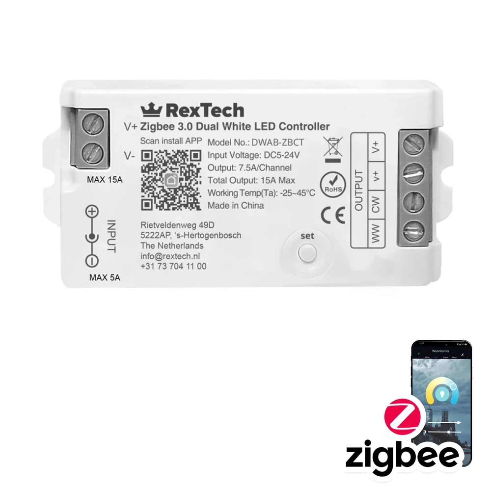 Zigbee 3.0 controller – voor Dual White led strips -Werkt met IKEA Tradfri, Osram Lightify en Tuya Smart Life De Zigbee controller is geschikt om led strips van LedstripKoning, die voordeliger zijn dan de bekende merken, te laten communiceren met uw favoriete licht-app en bridge. Een bijzonder handige gadget voor gebruikers van slimme verlichting. Kenmerken Zigbee 3.0 controller voor Dual White led strips Led strips compatibel maken met IKEA Tradfri, Osram Lightify en Smart Life Te gebruiken i.c.m. alle Dual White led strips Eenvoudig te installeren Ook compatibel met Amazon Alexa Werkt niet samen met Apple Homekit De Zigbee controller is een praktisch product binnen de Smart Home domotica, ofwel slimme verlichting. Hij is speciaal ontwikkeld voor wie slimme verlichting in zijn bezit heeft. Indien u uw favoriete verlichtingslicht-app wilt gebruiken met onze Dual White led strips, is de Zigbee controller precies wat u zoekt. Deze maakt de uw app namelijk compatibel met andere led strips. U kunt overigens ook de apps van andere domotica-merken zoals Ikea Trädfri of Amazon Alexa, compatibel maken met uw nieuwe led strips. Het installeren van de Zigbee controller is eenvoudig. U sluit hem aan tussen de led strip en de adapter. Tevens koppelt u de controller met uw Zigbee bridge. Hierna kunt u de app zo instellen dat hij communiceert met uw led strips.