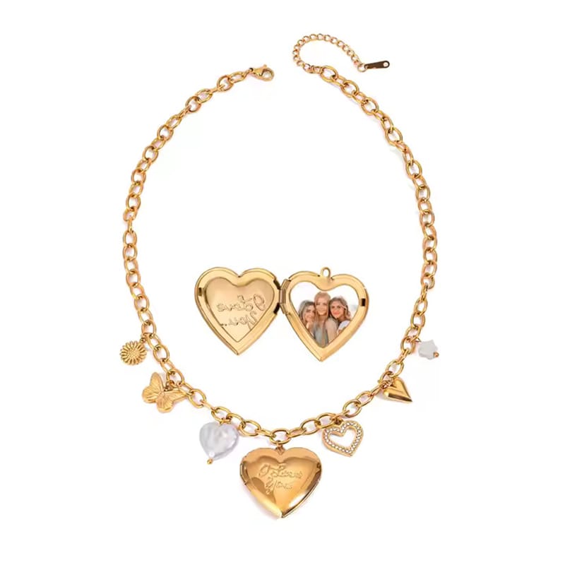 Super hip deze bedelketting met medaillon, hartjes en parels. Bewaar jouw geliefde, beste vriendin of huisdier in het medaillon en draag diegene dicht bij je hart.