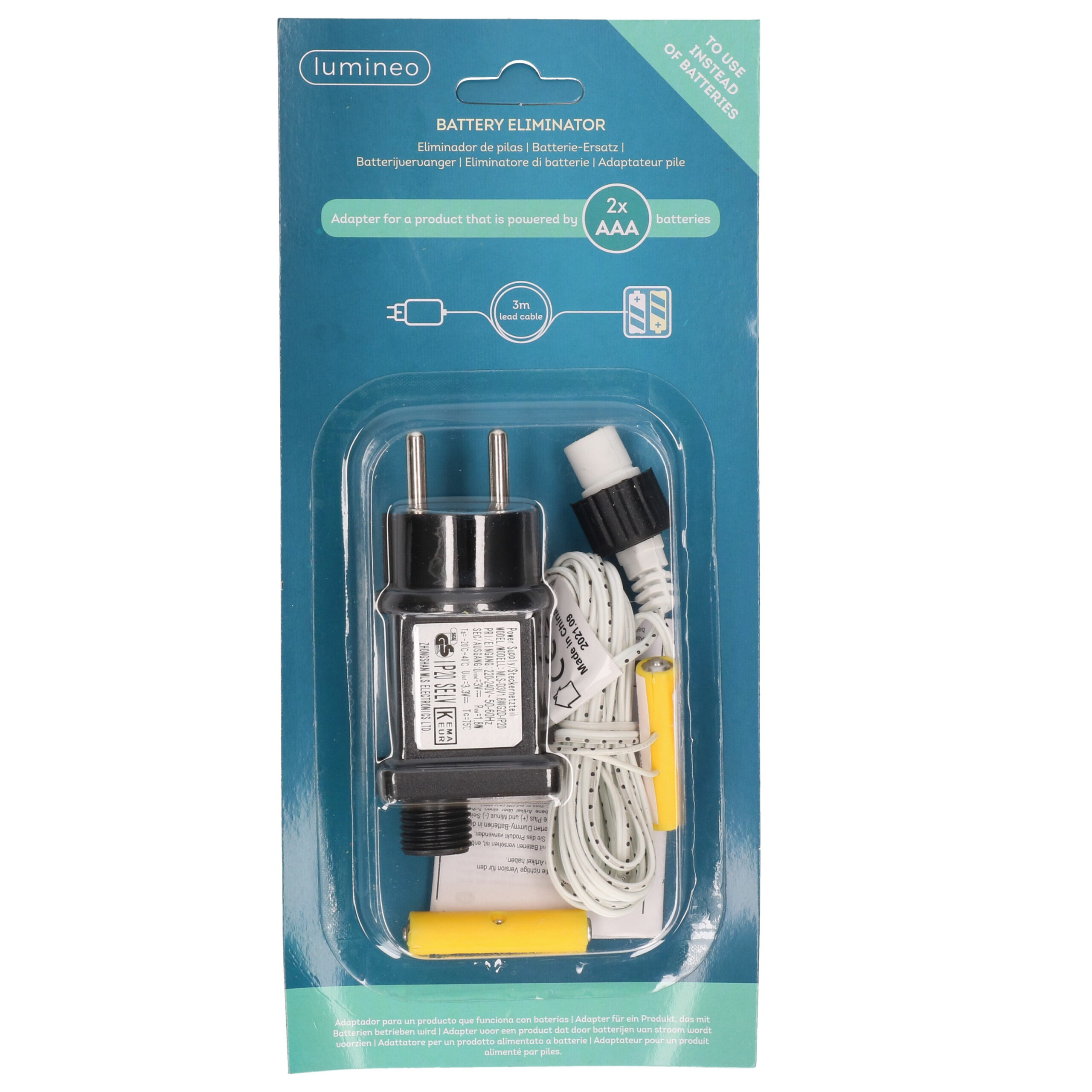 Bekijk product bij Surprises-winkel.nl — bestel vandaag nog en ontvang de Lumineo Adapter – 2x – voor 2 AAA batterijen – batterij vervanger – 300 cm aanloopsnoer snel thuis.