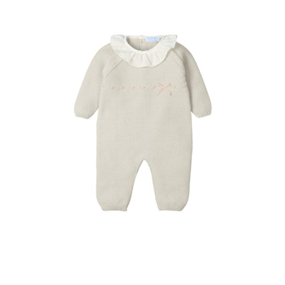 Lief fijn gebreid boxpakje van Mac ilusion. Het boxpakje heeft een katoenen kraagje en een roze velours strikje op het voorpand. Het boxpakje sluit aan de achterkant en tussen de beentjes met knoopjes. Kleur Natural